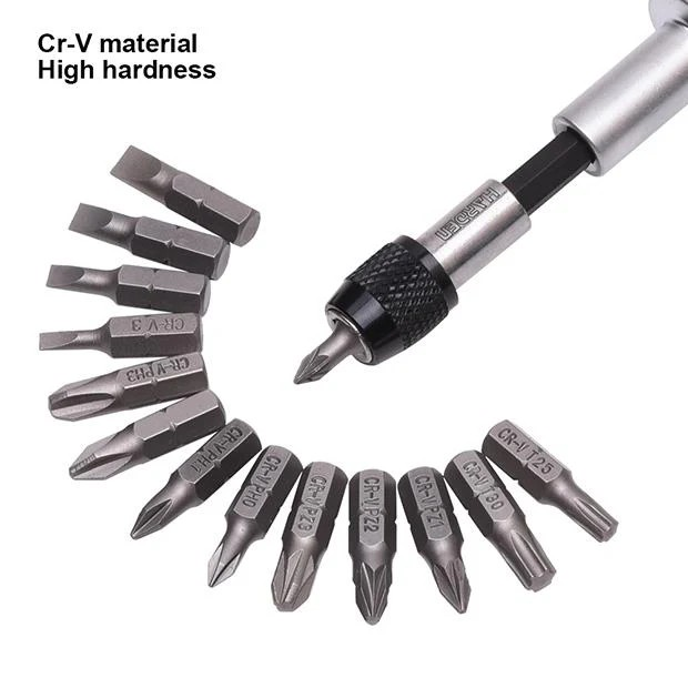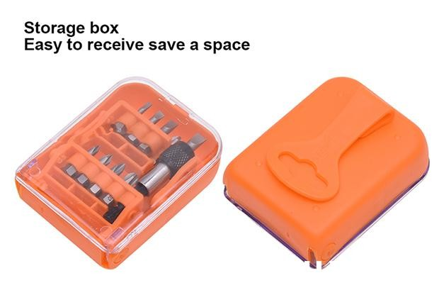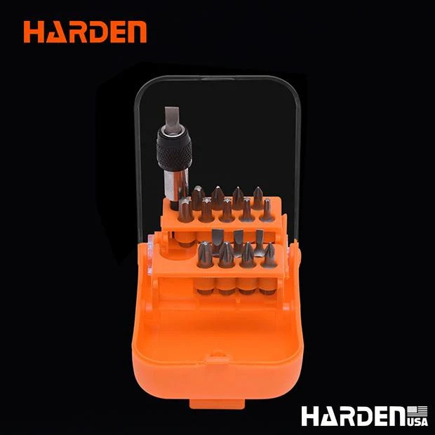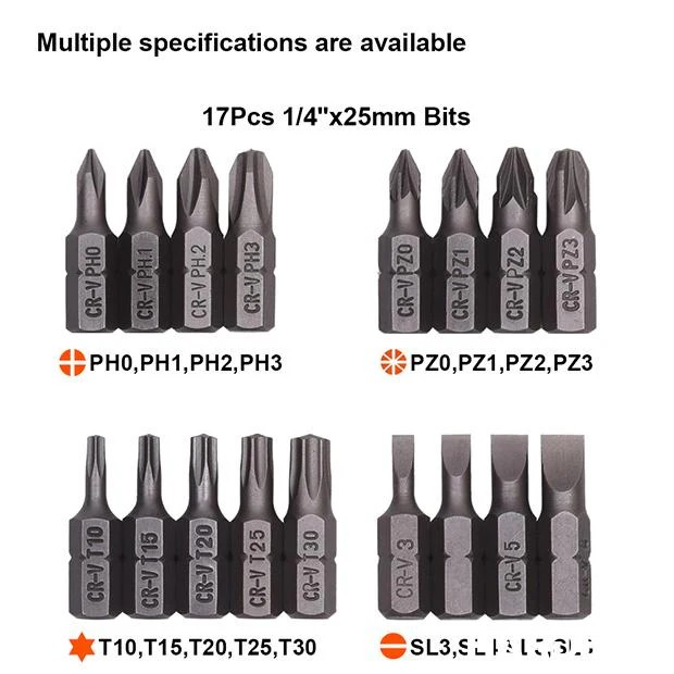*17 Adet uç: (Yivli) SL3, SL4, SL5, SL6; (Phillips) PH0, PH1, PH2, PH3; (Pozi) PZ0, PZ1, PZ2, PZ3, (Torx) T10, T15, T20, T25, T30